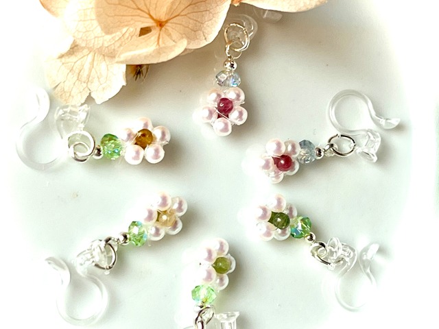 耳もとに、やわらかな光を添える小花一輪。 碧玺とパールで表現した小さな花が、控えめなきらめきで表情を明るく見せてくれます。主張しすぎず、装いに自然となじむデザインは、オフィスにも日常のカジュアルにも心地よく寄り添います。 耳に触れる部分には樹脂素材を使用し、ふんわりとしたカーブでやさしくフィット。着けやすく、はずれにくい仕様です。その他の金属部分にはシルバー925メッキを施し、肌の弱い方にも安心してお使いいただけるよう素材にも配慮しました。