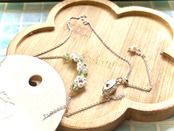 花びらにパールをあしらった小花のネックレスです。花びらに使っているパールの直径は3ミリで、さりげなく胸元を飾ります。